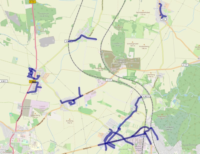 Karte mit Straßenkennzeichnung der betroffenen Straßen