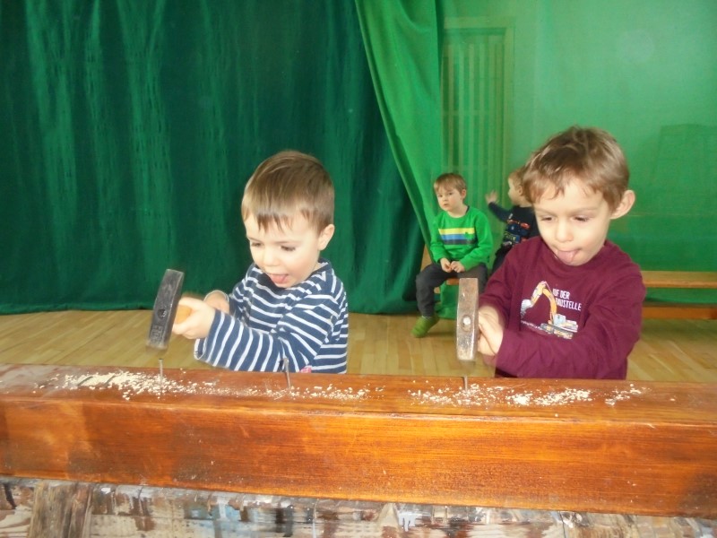 Am nächsten Tag warteten wir ganz aufgeregt auf unseren Dachdecker. Welche Überraschung würde es wohl geben? Dann war es soweit. Herr Herrich kam mit zwei Holzbalken unter dem Arm in die Sporthalle. Was hatte das zu bedeuten? Natürlich wurde das Geheimnis gelüftet. An der 1. Station konnten alle gemeinsam das Dachmodell mit Ziegeln eindecken. Also alle in einer Reihe angestellt und die Ziegel weiter reichen. An der 2. Station konnte jeder beweisen, wie geschickt er im Umgang mit Hammer und Nagel ist. Jedes Kind versuchte so gut es konnte, seinen Nagel (der echt groß war) mit dem Hammer in den Balken zu schlagen. Das war gar nicht so einfach, doch die Kinder hatten großen Spaß. Auch heute konnten die Kinder wieder einige Materialien für ihr Plakat einsammeln und so füllte sich langsam unser Plakat und gemeinsam mit den Erziehern wurde alles aufgeklebt.
