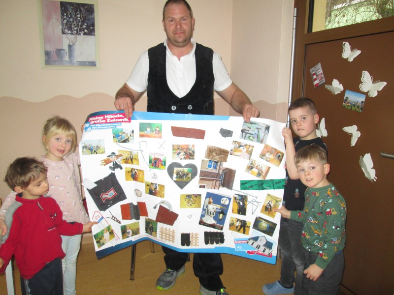Der Aufruf zu einem Wettbewerb der Handwerkskammer zu dem Thema „Kleine Hände, große Zukunft“ sprach uns sofort an und alle Kinder wollten sofort mitmachen. Doch welchen Beruf sollen wir denn nehmen? In einem Gesprächskreis mit den Käfer- und Mäusekindern erfuhren wir erst einmal was Mama und Papa für Berufe haben und ob diese zu einem Handwerksberuf gehören.