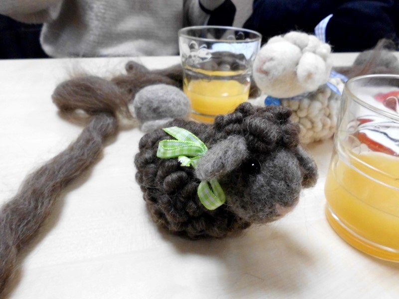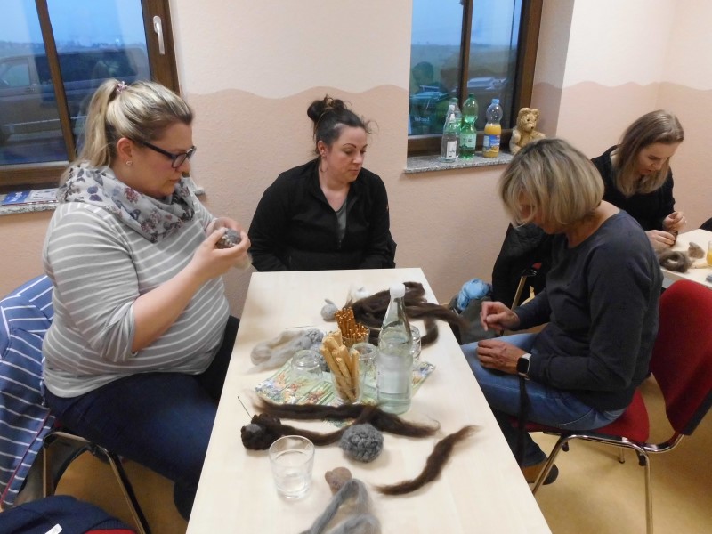 Das Filzen fand in den Räumen der Krippengruppe unter Anleitung von Fr. Martina Weis statt. Ein herzliches Dankeschön an dieser Stelle. Ausreichend Material stand zur Verfügung und Frau Weis unterstützte, wo sie konnte. Einige Eltern zeigten beim Basteln ihr großes Talent. Zwei Mamas und ein Papa waren so versunken in die Arbeit, dass sie ihr Schäfchen im Nu fertig stellten. Damit scheint die entspannende Wirkung des Filzens als erwiesen. Eines sei aber gesagt: es sieht leichter aus als es ist. Und das Zwirbeln, Drehen, Kleben und Trockenfilzen braucht seine Zeit.
