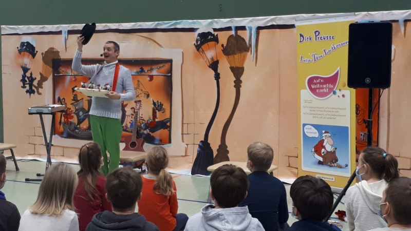 zu überraschen. Der Künstler Dirk Preusse lud die Kleinen und die Großen zu einem fantasievollen Besuch auf einem Weihnachtsmarkt ein. Es erklangen weihnachtliche Lieder, welche die Kinder mit Bewegungen und Worten begleiten konnten.