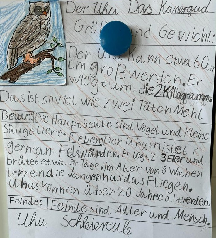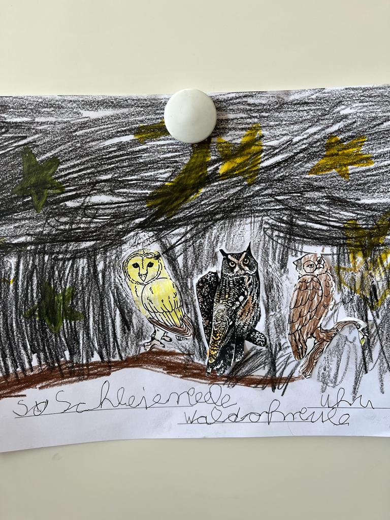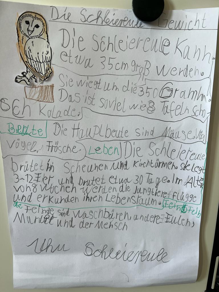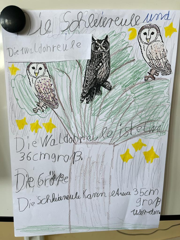 Für die Schüler der ersten Klassen war es interessant herauszufinden, welche heimischen Eulenarten es gibt. Der Uhu und die Schleiereule erfreuten sich besonderer Beliebtheit. Manchmal wurde aus der „Waldohreule“ die „Urwaldeule“.
