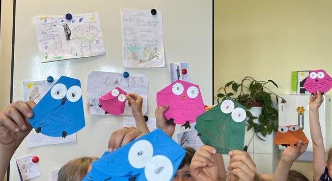 Die Kinder erfuhren, wo Eulen nisten, was sie fressen und wie sie jagen. Mäuse stehen bei allen ganz oben auf dem Speiseplan. Am Ende hat jedes Kind ein eigenes Informationsblatt gestaltet und eine Eule gebastelt.