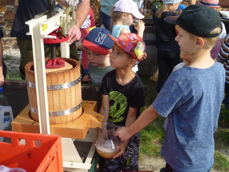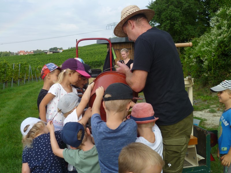 Herr Loose nahm sich viel Zeit und erklärte den Kindern alles zur Traube. Im Anschluss durften alle Kinder und natürlich auch Herr Sang eigenhändig Trauben ernten. Jeder durfte mit seiner eigenen Schere und seinem Eimer ausgestattet die Trauben von den Weinreben schneiden. Naschen von den Weinstöcken war nicht erlaubt, es durfte nur von geernteten Trauben probiert werden. Wenn man von der Rebe einzelne Trauben pflückt, werden durch einen Resttropfen Saft die Wespen angelockt, die dann den anderen Trauben schaden. Mit vollen Eimern ging es dann zur Presse, die Herr Loose ausführlich erklärte. Nun zeigte der Winzer, wie der Zuckergehalt in den Trauben gemessen wird. Jetzt war die Muskelkraft von Herrn Loose gefragt, der gemeinsam mit den Kindern die geernteten Trauben zu Saft presste. Zum Abschluss konnte sich jedes Kind mit dem selbst gepressten Traubensaft stärken, bevor der Rückweg angetreten wurde. Die Kinder und Erzieher bedanken sich auf diesem Weg nochmal recht herzlich bei Herrn Loose und Herrn Sang für dieses tolle Erlebnis.