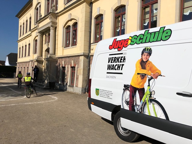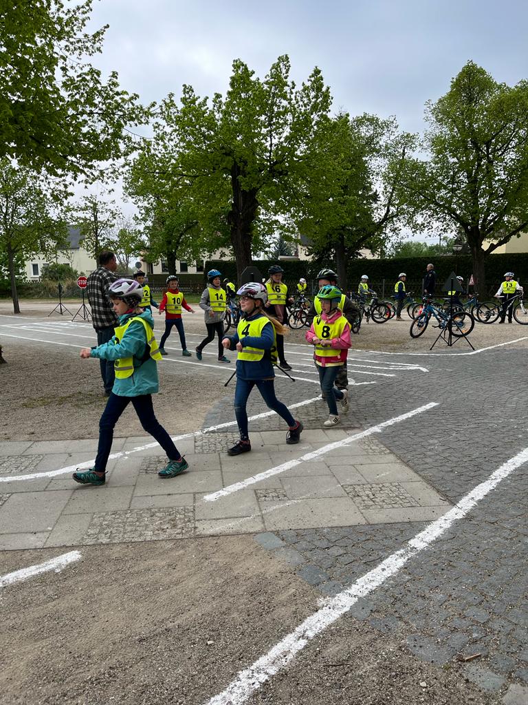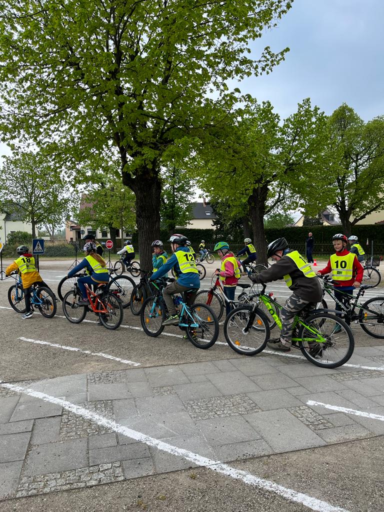 Nachdem alle Schüler der vierten Klasse den theoretischen Teil der Ausbildung erfolgreich abgeschlossen hatten ging es an die praktischen Übungen. Hierzu verwandelte sich der Schulhof mit Hilfe unseres Hausmeisters, Herrn Richter, in einen Verkehrsgarten. Die praktischen Ausbildungsstunden wurden von der Polizei Sachsen durchgeführt, welche von der Verkehrswacht tatkräftig unterstützt wurde.