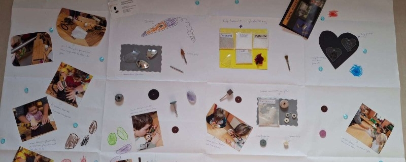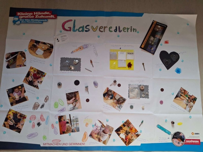 Gemeinsam mit den Kindern gestalteten wir noch ein tolles Plakat, worauf genau zu erkennen war, was alles zu dem Beruf des Glasveredlers gehört. Das Plakat für den Wettbewerb „Kleine Hände, große Zukunft“ haben wir dann online nach Berlin geschickt und in Papierform an die Handwerkskammer Dresden. Nun heißt es Daumen drücken, dass wir wieder auf den vorderen Plätzen landen werden.