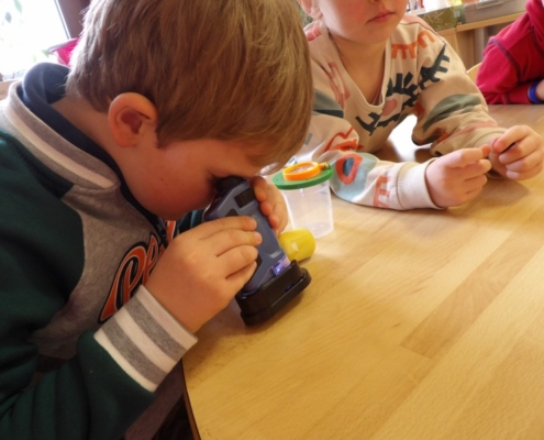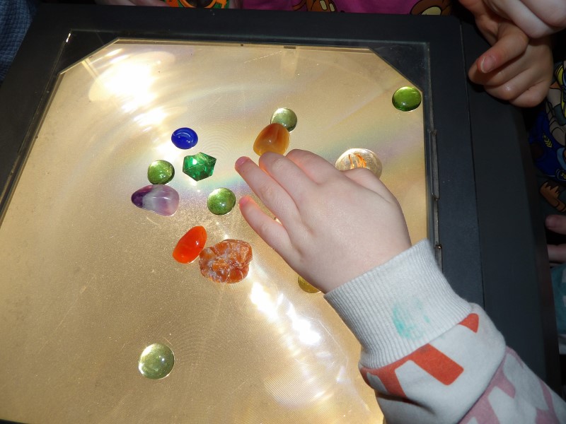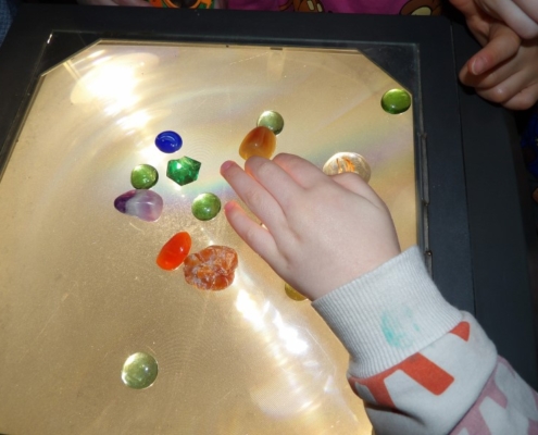 Am nächsten Tag brachten alle Kinder von zu Hause ihre gesammelten Schätze vom letzten Sommerfest mit und wer hatte, noch eine Lupe oder Mikroskop. Wie echte Wissenschaftler nahm nun jedes Kind seine Glasnuggets sprichwörtlich unter die Lupe. Und siehe da, manche Steine hatten kleine Blasen und Striche im Glas. Jeder Stein hatte etwas Besonderes in seinem Innenleben und war somit ein richtiger Schatz. Zum Schluss legten alle Kinder ihre bunten Steine auf den Polylux und es war ein schönes buntes Bild aus Steinen zu sehen.