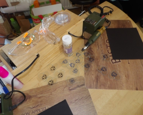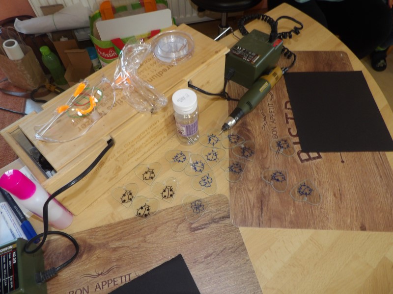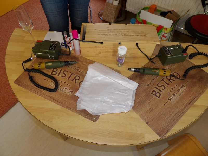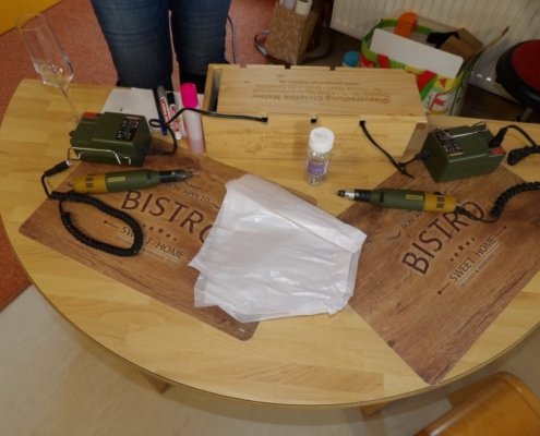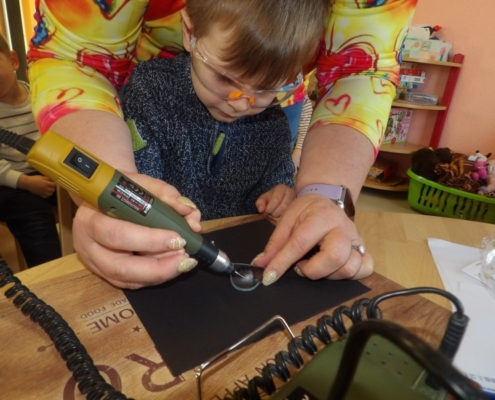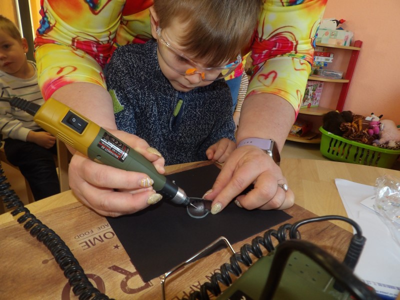 Gespannt warteten alle Kinder sehnsüchtig auf Frau Melzer. Mit einem freudigen „Hallo Kinder“ begrüßte sie uns und betrat das Mauszimmer, wo wir schon die Tische bereitgestellt hatten. Voller Neugier schauten wir auf die Taschen, welche Frau Melzer mitgebracht hatte und in unserem Beisein auspackte. Die Augen der Kinder wurden immer größer, als sie die Geräte auf den Tisch legte, welche wir dann zum selbst gravieren, benutzen durften. Sie erklärte die Geräte kurz und benannte sie mit Namen. Im Anschluss zeigte sie uns einige Stücke, die sie selbst gestaltet hatte z.B. verschiedene Gläser mit tollen Motiven oder Laternen. „Wie macht man sowas?“ fragte ein Kind. „Genau das könnt ihr jetzt selbst einmal ausprobieren“ sagte Frau Melzer und holte kleine Glasherzen hervor, auf denen kleine Motive mit „Glückskäfer“ oder „Kleeblatt“ vorgezeichnet waren. Nun konnte jedes Kind allein oder mit Hilfe der Erzieherin und Frau Melzer, mit einem Dremel dieses Motiv nach gravieren. So aufgeregt die Kinder am Anfang auch waren, so stolz erzählten und zeigten sie am Nachmittag den Eltern ihr selbst gestaltetes Herz.