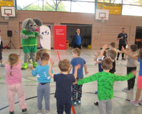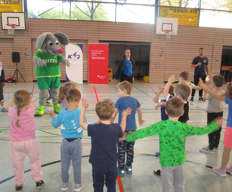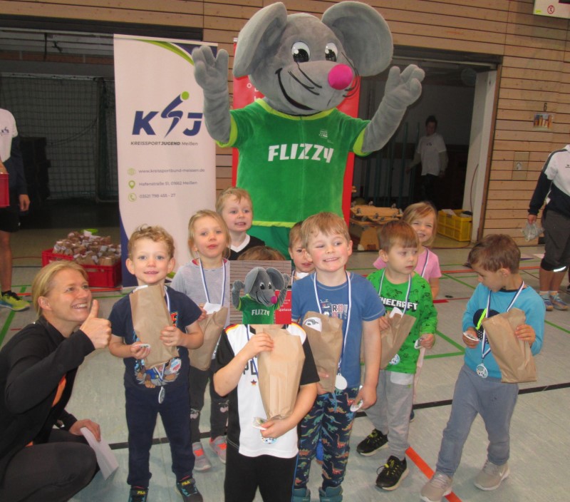 Mit 9 vier- bis fünfjährigen Kindern der Mausgruppe machten wir uns, mit drei Elternfahrgemeinschaften, auf den Weg nach Meißen, denn Flizzy – die Sportmaus – vom Kreissportbund Meißen e.V. hatte zum Ablegen des Sächsischen Sportabzeichens eingeladen.