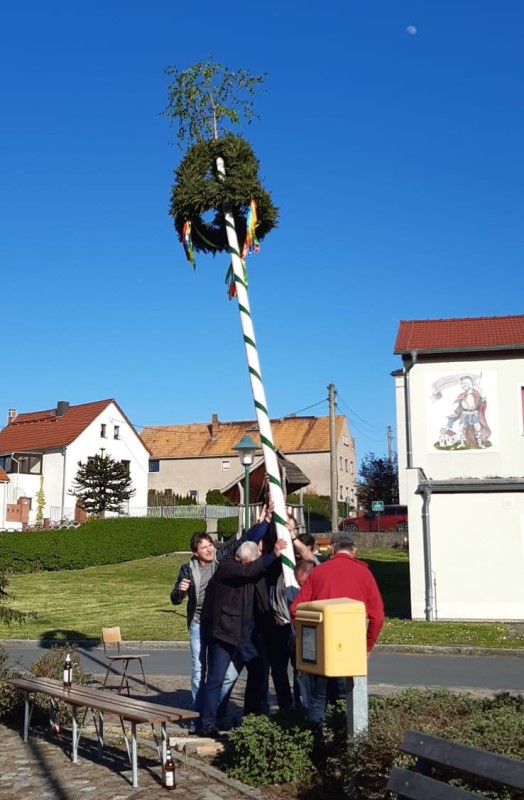 Wie es Tradition in Großdobritz ist, fanden sich schneidfreudige Helfer für das Maigrün am 27.04. bei Familie Anders ein. Am 28.04. wurde ab 17 Uhr das Grün geschnitten, zugereicht und zu einer schönen vollen Krone für den Maibaum gebunden. Am 30.04. lud der Heimatverein Großdobritz e.V. ab 17 Uhr zum Maibaumstellen. Bei wunderschönstem Frühlingswetter fanden sehr viele Besucher zu unserem Fest auf dem Dorfplatz. Somit waren Bratwürste und Leberkäsbrötchen schnell in den Bäuchen verschwunden. Unsere neu eingeführten Schnittchen mit Aufstrichen brauchten etwas Anlauf wurden aber auch lobend verspeist. Es war ein sehr gelungener Abend und ein wunderbarer Auftakt in den Mai.