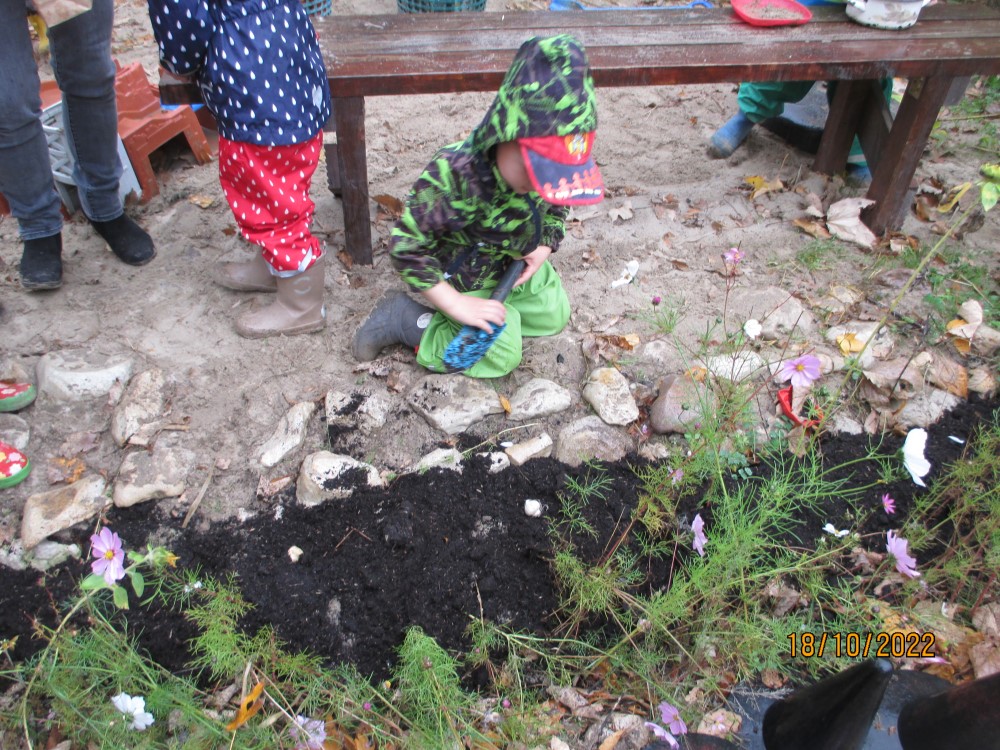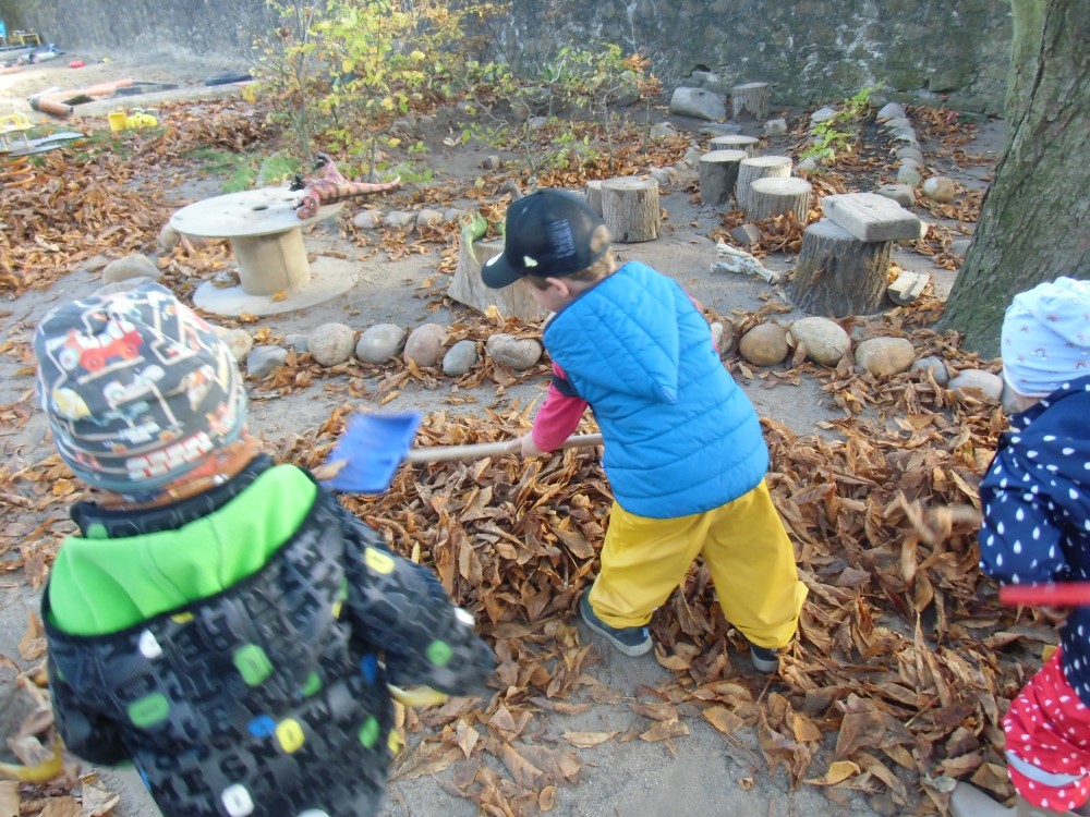 Jetzt gibt es viel zu entdecken, im großen Garten der Kindertagesstätte in Oberau. Die großen Bäume, die im Sommer ein toller Schattenspender waren, zeigen sich in ihren schönsten Farben. Die Kinder bewundern die Blattfärbung in rot, gelb, braun, sammeln Kastanien, Eicheln, Nüsse und bunte Blätter. Fleißige kleine Gärtner ernten Kartoffeln und bereiten den Garten für das Frühjahr vor. Da wird geharkt, gebuddelt und es werden Zwiebeln von Frühblühern in die Erde gebracht.