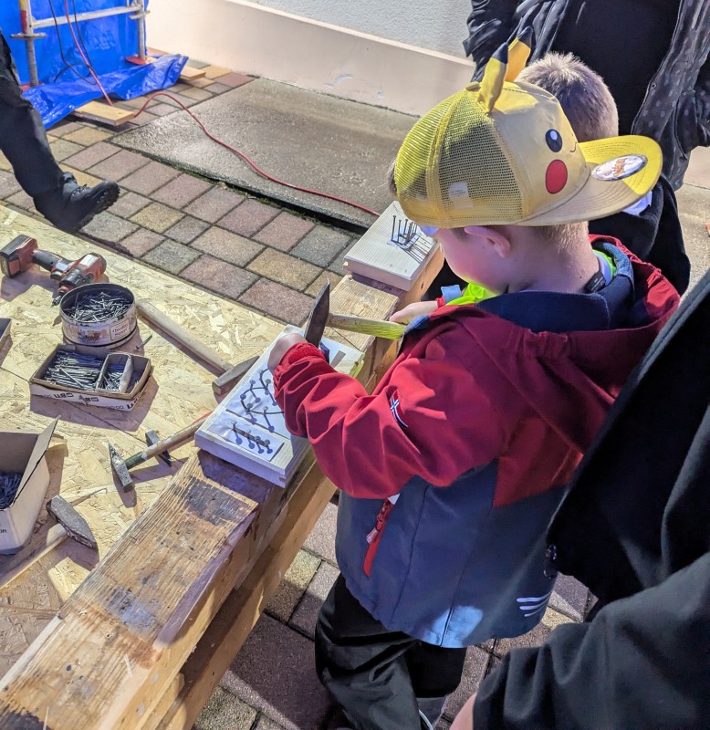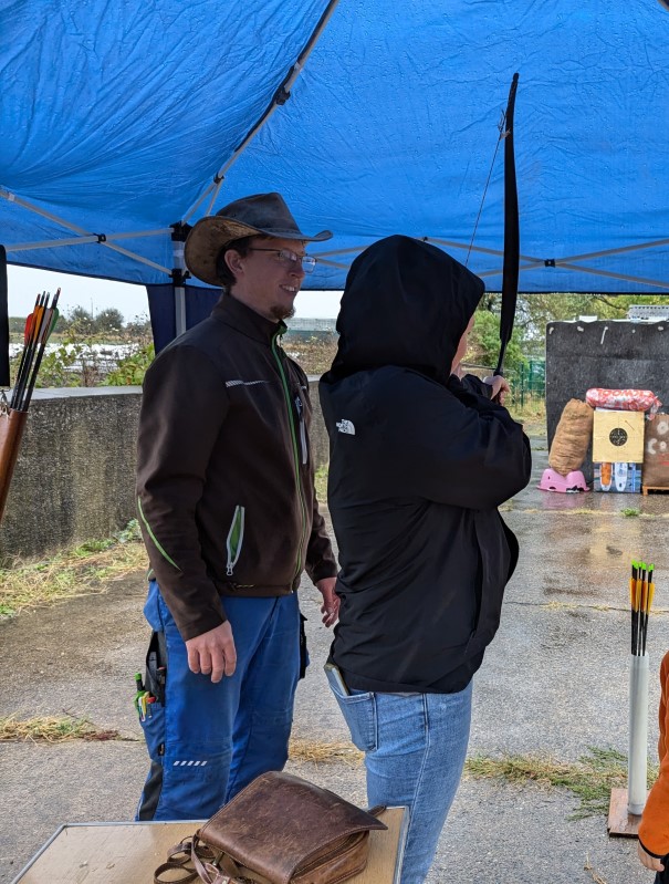 Auch Familie Seifert hatte schon am Vortag im Hof einen Unterstand für fleißige Handwerker errichtet. Dort herrschte nun großer Andrang beim Gestalten von Nagelbildern. Mit viel Geschick und Geduld wurden nach Vorlagen Nägel in Holzbretter geschlagen und anschließend mit bunter Wolle verziert. Nebenan konnte jeder sein Geschick mit Pfeil und Bogen beweisen! Für Treffsicherheit geduldig angeleitet von Manuel Radloff, der trotz des ungemütlichen Wetters im Freien die Kinder für das Bogenschießen begeisterte.