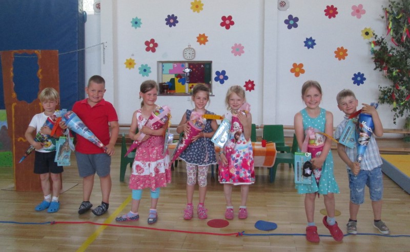 Nach unserer Abschlussfahrt gab es noch ein Highlight- unser Zuckertütenfest in der Turnhalle. Darauf hatte sich die ganze Mausgruppe schon seit vielen Wochen vorbereitet und fleißig geübt. Es wurden Kulissen gebastelt, Kostüme ausgeliehen, Gedichte und Lieder gelernt und ein Märchenspiel einstudiert- „Schneewittchen und die sieben Zwerge“. Auch die Mittelgruppenkinder waren voller Elan dabei. Jeder musste seine Rolle lernen. Da gab es Schneewittchen, die böse Königin, den Jäger, den Spiegel, die sieben Zwerge und natürlich den Prinzen. Die Kinder der Käfergruppe waren auch fleißig und sind mit dem „Wischi-Waschi-Lied“ aufgetreten. Das Programm war ein voller Erfolg- vielen Dank an die kleinen Künstler und Schauspieler. Die Schulanfänger fragten sich, ob denn auch die Zuckertüten vom Baum groß geworden sind. – ja zum Glück sind sie gut gewachsen, denn jeder Vorschüler konnte eine Zuckertüte mit nach Hause nehmen. Zum Abschluss wurde noch gemütlich Kaffee getrunken und der von den Eltern selbst gebackene Kuchen verspeist. Im Anschluss an das Zuckertütenfest waren alle Erzieher von den Eltern zu einem gemütlichen Grillabend eingeladen. Dort wartete eine schöne Überraschung auf uns – eine von den Schulanfängern selbst gestaltete große Maltafel mit ganz viel Kreide- als Abschiedsgeschenk für unseren Kindergarten. Die Tafel wurde sogar gleich am Gartenzaun befestigt, sodass sie gleich genutzt werden konnte. Es war wirklich ein sehr schöner Abend und wir wurden von den Eltern mit Speis und Trank verwöhnt. Wir bedanken uns ganz herzlich bei allen Eltern, die bei der Gestaltung des Geschenkes und des Abends mitgeholfen haben.