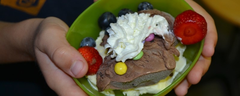 Spannend zu beobachten war dabei, wie unterschiedlich die Kinder ihre Eisbecher gestalteten. Einige Kinder entschieden sich nur für eine Eissorte und eine weitere Zutat. Die buntesten Becher hatten aber gleich alles. Jeder konnte eben das essen, was er mag. Auch die Absprachen klappten ohne Probleme. Die Kinder wussten, dass sie von allen Zutaten etwas nehmen konnten, aber nur so viel, dass für jeden der möchte, etwas da ist.