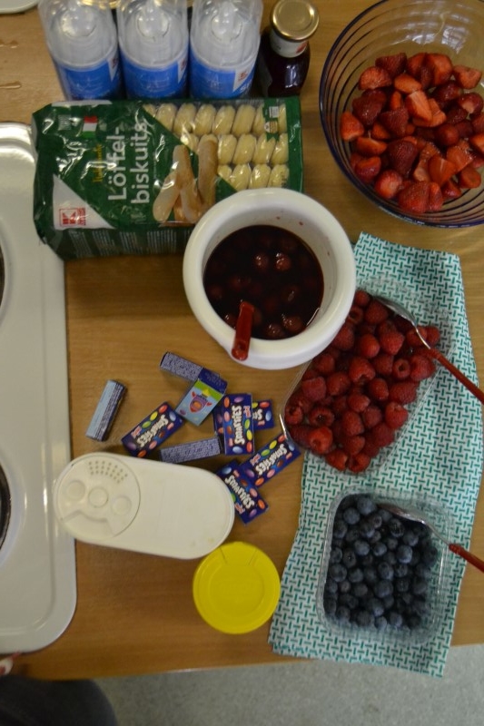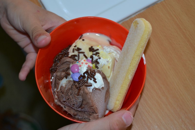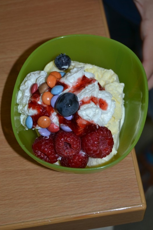 So kam es, dass ein geplanter Ausflug zur Eisdiele entfiel und dafür hier eine Eisdiele entstand. Für den kleinen Preis von nur einem Euro erwartete die Kinder bei uns nicht nur eine einfache Kugel Eis. Sie hatten die Wahl aus Schoko, Vanille und Erdbeere. Doch die Kinder konnten noch mehr entschieden. Es gab auch noch Vanillesoße, Erdbeersoße, Schokoladensoße, Erdbeeren, Himbeeren, Heidelbeeren, Kirschen, Smarties, bunte Streusel, Schokostreusel, Löffelbiskuit und Sahne. Es blieben also keine Wünsche offen,