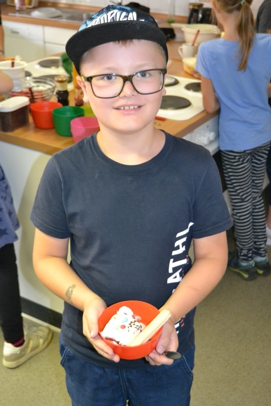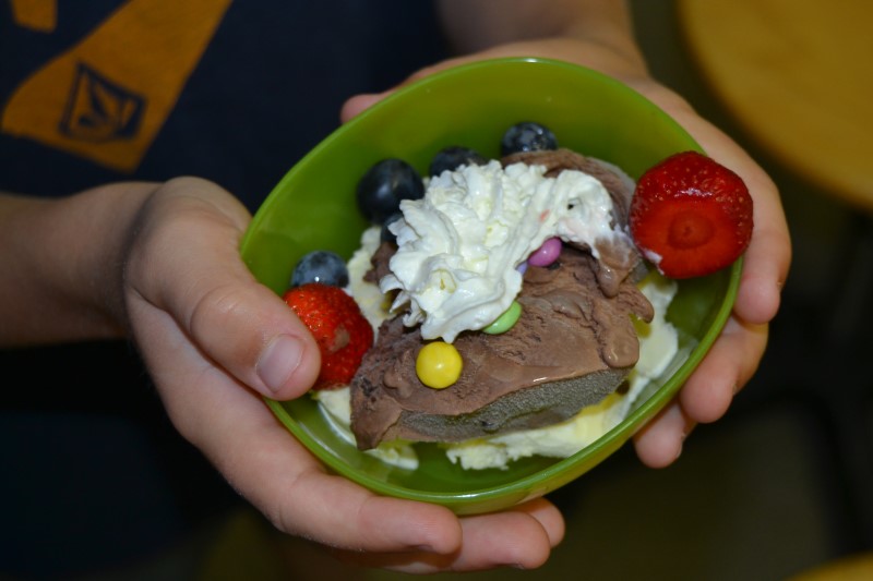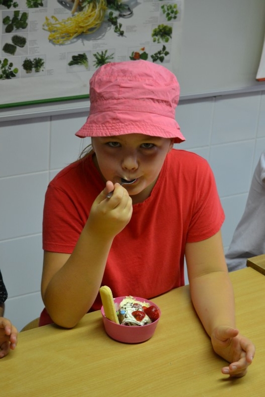 Spannend zu beobachten war dabei, wie unterschiedlich die Kinder ihre Eisbecher gestalteten. Einige Kinder entschieden sich nur für eine Eissorte und eine weitere Zutat. Die buntesten Becher hatten aber gleich alles. Jeder konnte eben das essen, was er mag. Auch die Absprachen klappten ohne Probleme. Die Kinder wussten, dass sie von allen Zutaten etwas nehmen konnten, aber nur so viel, dass für jeden der möchte, etwas da ist.