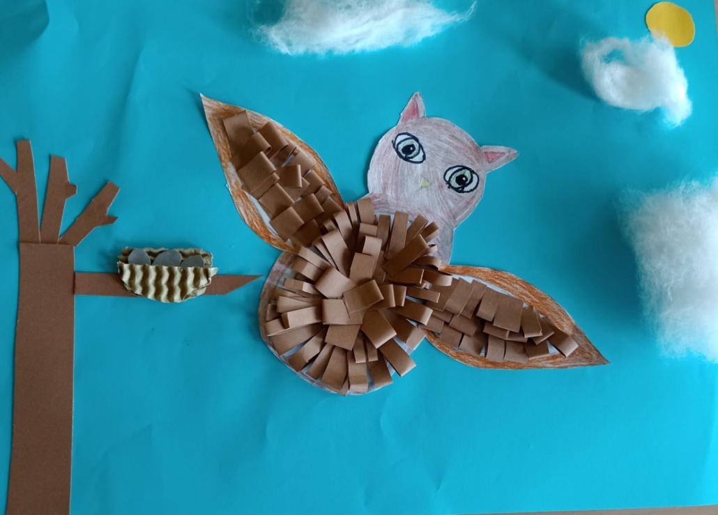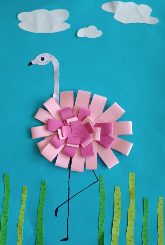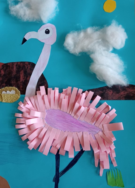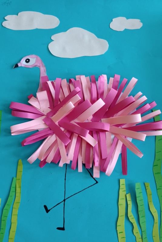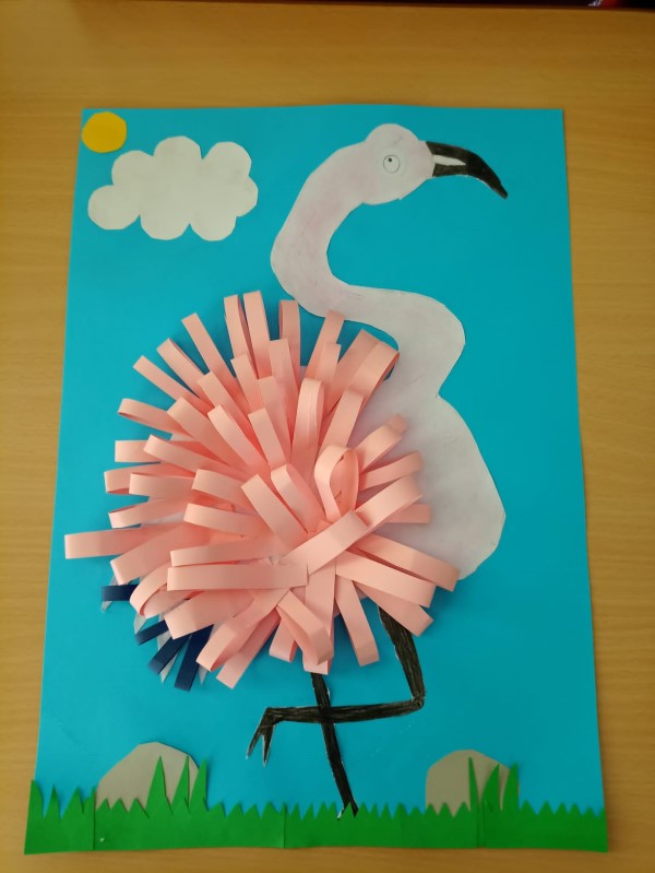 Herrliche Bilder mit witzigem Federvieh entstanden im Kunstunterricht der vierten Klassen. Der Plan war, eine Collage aus Papier zu gestalten. Schnell war die Idee geboren, dass die farbigen Papierstreifen gut als Federn dienen könnten – zum Beispiel um einen Flamingo darzustellen. Die Gedanken wurden zusammengetragen und es dauerte gar nicht lange, bis weitere Ideen aus den kreativen Kinderköpfen sprudelten. So entstanden neben einer lustigen Schar Flamingos auch Bilder von Eulen und Pinguinen mit einem tollen 3-D-Effekt.