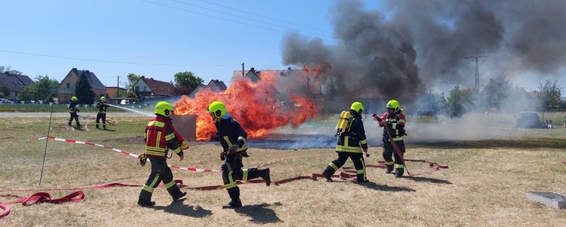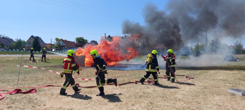 Am Sonntag stellte sich die Freiwillige Feuerwehr Ockrilla bei den Jessener Einwohner vor. Sie luden mit einer Schauübung auf den Festplatz ein. Eine zu diesem Zweck errichtete Holzhütte geriet in Brand und entwickelte sich in Windeseile zu einem Flammenmeer. Die Hitzeentwicklung war enorm und drängte die Schaulustigen schnell zurück. Nun schlug die Stunde der Feuerwehr. Sie rückte in voller Ausrüstung an und begann umgehend mit der Brandbekämpfung. Dabei hatten sie sehr mit der starken Rauchentwicklung zu kämpfen, die übrigens im Umland nicht verborgen blieb. Ein umsichtiger Bürger wählte den Notruf, worauf die Sirenen aufheulten. Das konnte aber schnell von der Einsatzleitung geklärt werden.