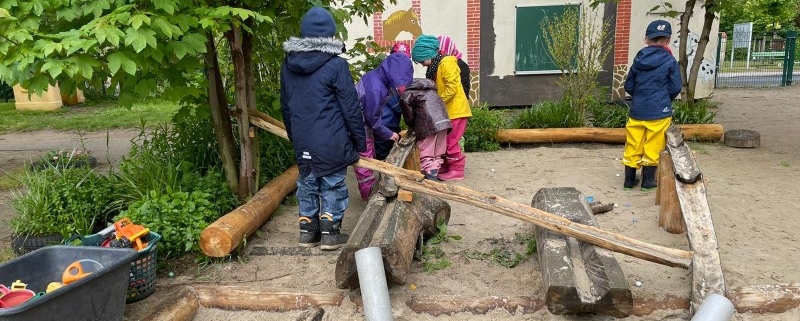 Etwas weniger sauber geht es nun im Garten zu. Durch die großartige Hilfe eines Opas der Igelgruppe, entstand eine Matschecke. Ein Fest für die Sinne. Es rauscht, es riecht, die Farbe des Sandes verändert sich, ebenso seine Konsistenz. Matschen ist eine beeindruckende Selbsterfahrung die Grob- und Feinmotorik anregen. Für die Kinder das Highlight im Garten.