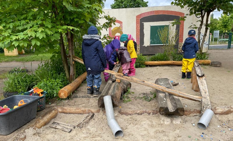 Etwas weniger sauber geht es nun im Garten zu. Durch die großartige Hilfe eines Opas der Igelgruppe, entstand eine Matschecke. Ein Fest für die Sinne. Es rauscht, es riecht, die Farbe des Sandes verändert sich, ebenso seine Konsistenz. Matschen ist eine beeindruckende Selbsterfahrung die Grob- und Feinmotorik anregen. Für die Kinder das Highlight im Garten.