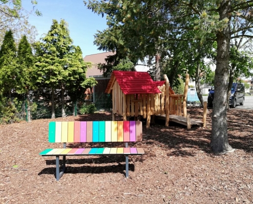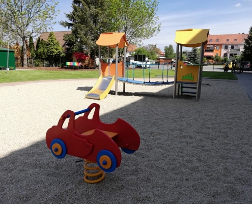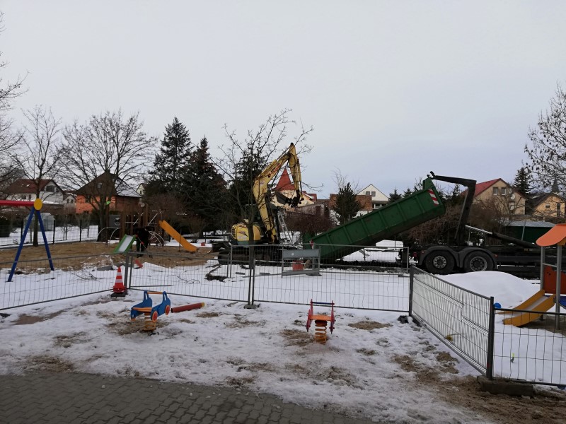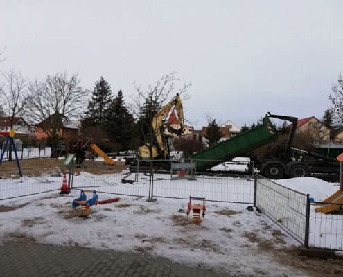Während der achtmonatigen Bauzeit verfolgten die Kinder gespannt die vielen Veränderungen. Nachdem zuerst die alten Spielgeräte abgebaut und ein barrierefreier Eingang errichtet wurden, bauten die Handwerker Klettergerüste, Schaukeln, eine Wippe sowie Wipptiere auf. Es folgten ein Rollerweg, Begrenzungen für die Spielgeräte sowie ein neuer Zaun auf der Seite zum Schulgässchen. Ein neuer Schuppen für die Spielgeräte sowie Sitzbänke wurden aufgestellt. Zum Schluss wurde die Freifläche begradigt und Rollrasen ausgelegt.