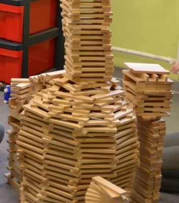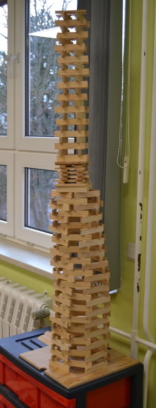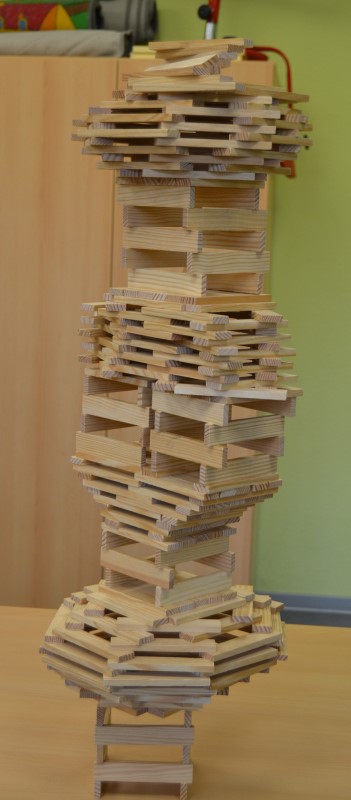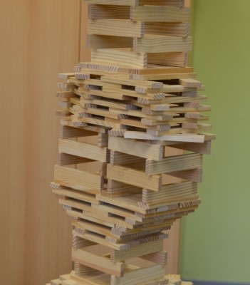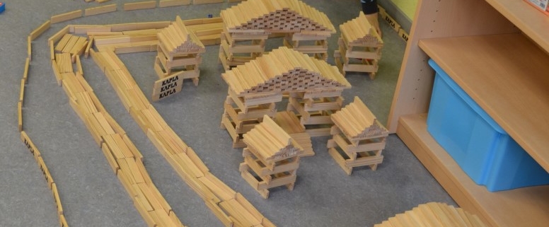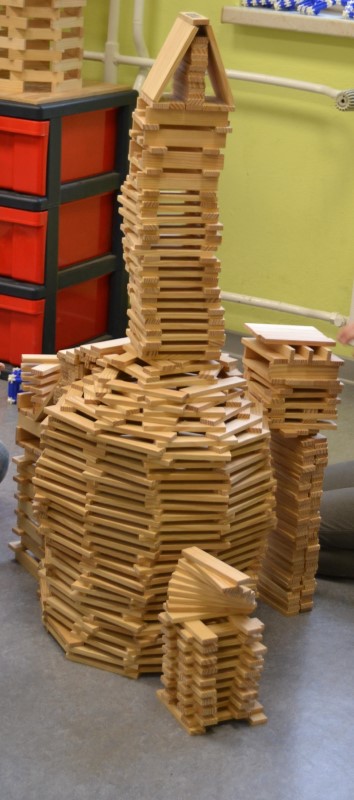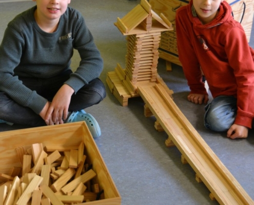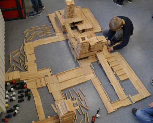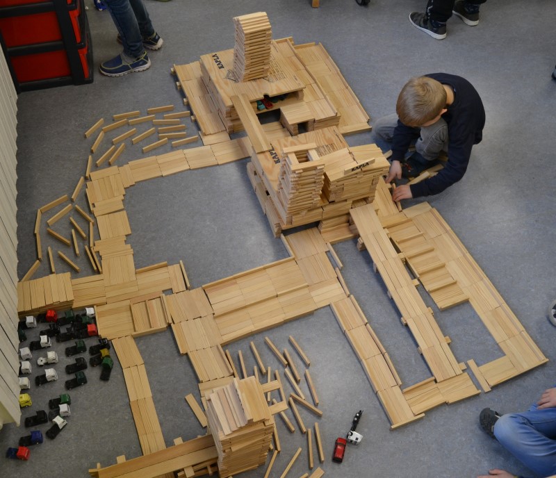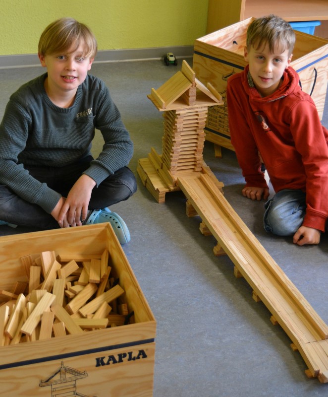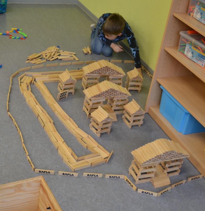 Gerade wieder sehr beliebt sind die Kapla-Steine. Sobald der Bauraum geöffnet wird, strömen die Kinder in Scharen in den Raum und ziehen sich eine der großen Kisten in eine Ecke und beginnen zu bauen. Es entstehen ganze Städte, verwinkelte Schlösser, riesige Mauern, hohe Türme und kurvige Straßen. Der Fantasie sind hier kaum Grenzen gesetzt.