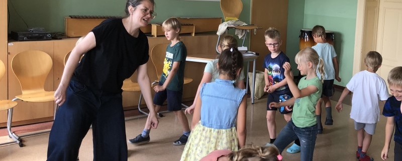 Auch die Singstimme wurde trainiert. Und siehe da: Jeder kann singen: … hohe Töne wie ein Gespenst und tiefe Töne eines starken Gorillas. Nachdem die Stimme warm war ertönte „Liebe Schwester tanz mit mir“ im Raum. Nun weiß jeder Erstklässler, dass dies ein Lied aus der Märchenoper “Hänsel und Gretel“ ist. Besonders andächtig lauschten die Kinder der Sopranistin Jennifer Riedel als diese die Arie „Der kleine Sandmann bin ich“ aus eben dieser Oper darbot.