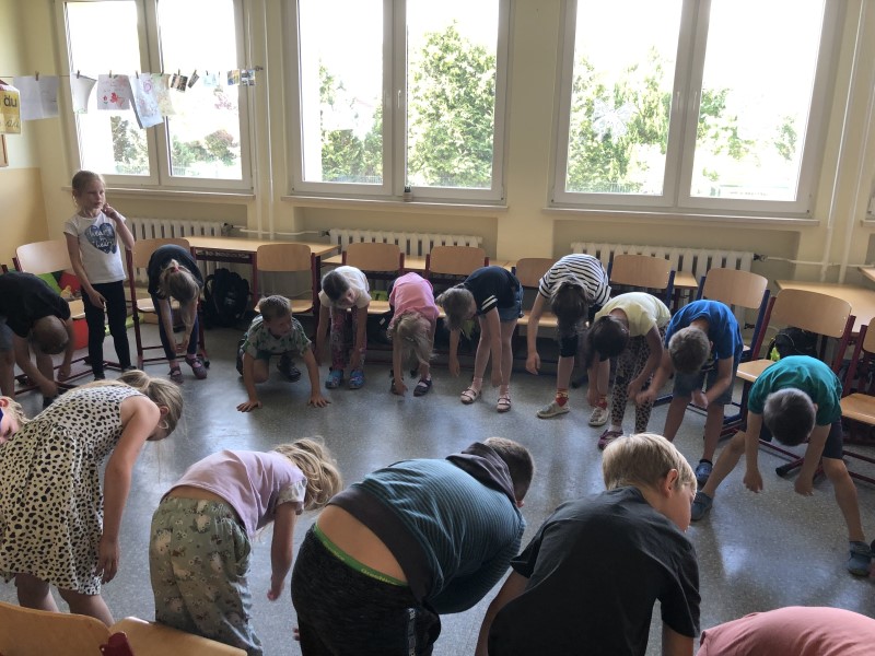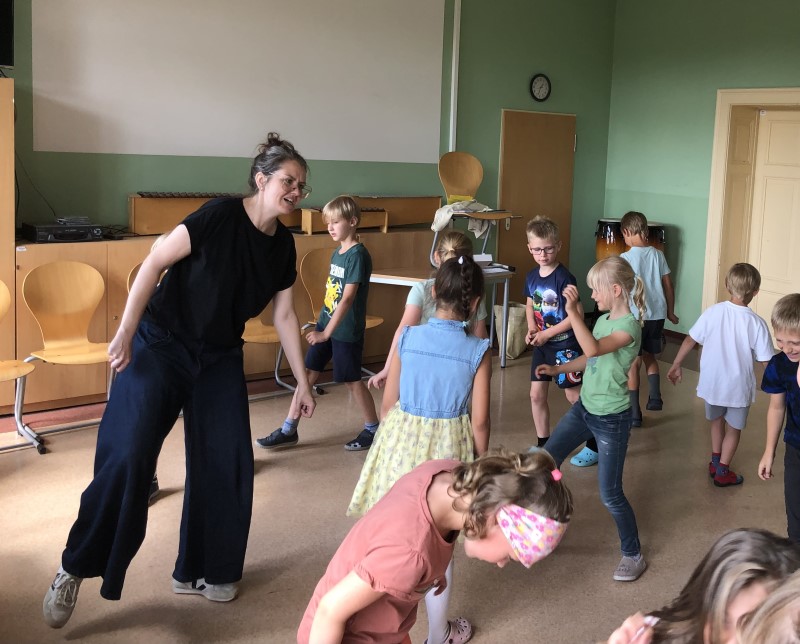 Auch die Singstimme wurde trainiert. Und siehe da: Jeder kann singen: … hohe Töne wie ein Gespenst und tiefe Töne eines starken Gorillas. Nachdem die Stimme warm war ertönte „Liebe Schwester tanz mit mir“ im Raum. Nun weiß jeder Erstklässler, dass dies ein Lied aus der Märchenoper “Hänsel und Gretel“ ist. Besonders andächtig lauschten die Kinder der Sopranistin Jennifer Riedel als diese die Arie „Der kleine Sandmann bin ich“ aus eben dieser Oper darbot.