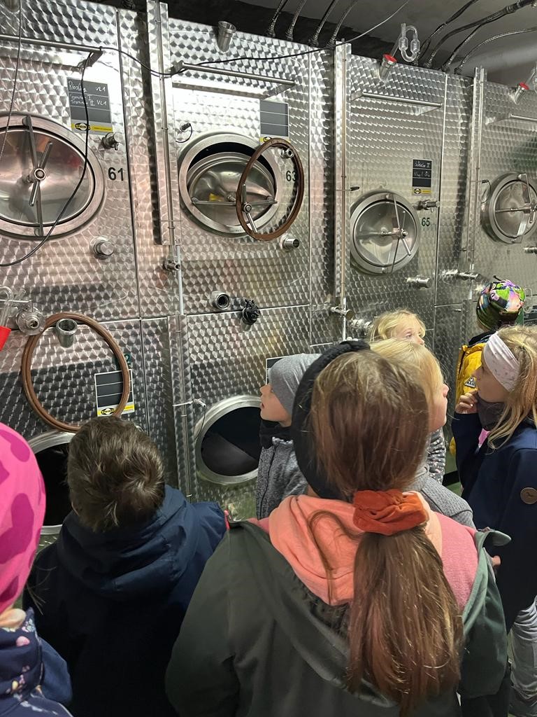Im Weingut der Familie Loose durfte zunächst im Weinkeller gefrühstückt werden. Anschließend bekamen die Kinder eine Führung in der Kelterei. Von der Weinpresse über die Gärtanks, bis zur Etikettiermaschine wurde alles unter die Lupe genommen. Am meisten Spaß bereitete das Klettern in einen der Gärtanks. Natürlich gab es eine leckere Saftprobe.