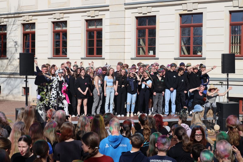 Unter diesem Motto feierten die 3 zehnten Klassen sowie die Hauptschüler der Klasse 9 dieses Schuljahr ihren allerletzten Schultag an der Oberschule Weinböhla. Nach fast einem halben Jahr Planung und Vorbereitung konnten am 16.04.2025 die Ideen der Schüler in die Tat umgesetzt werden. Sie verwandelten mit künstlerischem Talent und Antrieb durch die Lehrer den Schulhof und das Schulhaus in einen alten, lebendigen Bauernhof mit Kühen, Hühnern, Pferden sowie einem Pferdeanhänger, Schweinen, Strohballen, Traktoren (gemalt und original), Strohpuppen mit Lehrergesichtern, alten Milchkannen, Milch- und Eierpappen, Arbeitskleidung sowie Gummistiefeln, Schubkarren und einem großen Scheunentor. Mehrere Fotokulissen mit Tieren sowie eine Fotobox sorgten für Spaß und wertvolle Erinnerungsstücke auf dem Papier. An einer eigens gebauten Milch-Shake-Bar für die Kids der Klassen 5-9 gab es gratis Getränke. Zudem wurden die Mitschüler mit versteckten Oster-Süßigkeiten auf dem Schulhof und im Schulhaus sowie mit Äpfeln und Möhren von den Abschlussschülern verwöhnt. Als wertvolle Erinnerungsstücke an den Abschlussjahrgang 2025 bleiben der Oberschule Frühjahrsblüher im Blumenbeet im Eingangsbereich erhalten. Danke dafür!