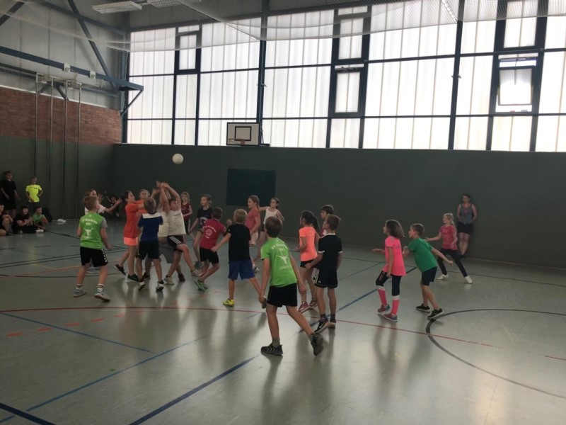 Bei den Klassenwettkämpfen im Staffellauf und dem Spiel „Ball über die Leine“ ging es spannend und fair zu. Die kleineren Klassen erzielten bei diesem Mannschaftsspiel „Trefferpunkte“, wenn es gelang, den Ball so ins gegnerische Feld zu spielen, dass dieser den Boden berührte. In der vierten Klasse war dies nicht mehr so einfach. Hier musste der Ball erst „gepritscht“ (abgewehrt) werden, bevor er gefangen werden durfte. Dies ist eine wunderbare Vorbereitung auf den Volleyballsport in den weiterführenden Schulen.