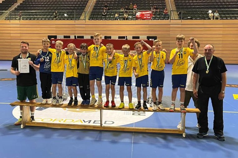 Nach der Mittagspause stand die Spielform an. Bei sieben Mannschaften wurde im Modus „Jeder-Gegen-Jeden“ gespielt, bei einer Spielzeit von 2 x 5 Minuten je Begegnung. Dabei konnten wir gegen jede andere Mannschaft gewinnen: HC Elbflorenz II, BSV Limbach-Oberfrohna, SV Chemie Zwickau, NSG EHV/NH Aue, TBSV Neugersdorf und HC Elbflorenz I. Damit war auch in der Spielform Platz Eins gesichert. Im Rahmen der Siegerehrung durften wir noch die Medaillen und den verdienten Applaus der Zuschauer entgegennehmen, was natürlich für strahlende Kinderaugen sorgte.