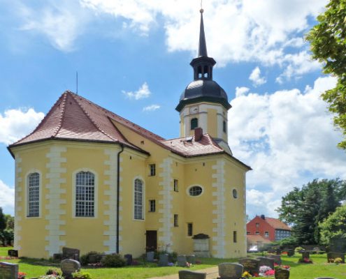 Nähert man sich, von Dresden kommend, durchs Elbtal der Stadt Meißen, dann winkt vom Horizont, hoch über der Nassau, der Kirchturm von Gröbern – leuchtend hellgelb, mit schwarzer glockenförmiger Haube und schlanker hoher Spitze.