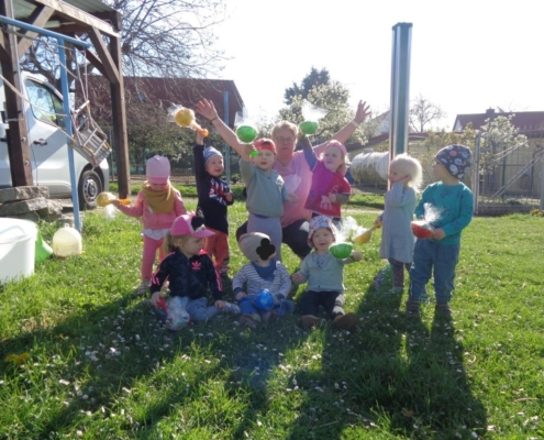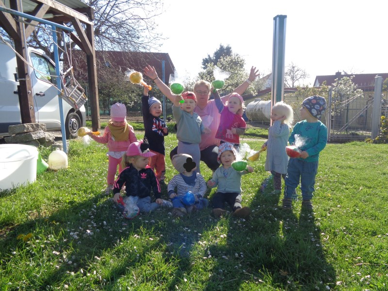 Auf der Suche nach dem Osterhasen und seinen Osterverstecken starteten die Käfer-, Maus- und Hasengruppe am 16. April zu einem kleinen Osterspaziergang. Die Igelgruppe nutzte die Gelegenheit, um einmal den großen Krippengarten für sich allein zu haben und die Freude der Kinder war groß, als die Osternester entdeckt wurden. Die Käferkinder fanden ihre Ostergeschenke bei Familie Leutert im Garten. Dort konnten sie ausgiebig Spielen und wurden ganz liebevoll mit Getränken und Naschereien versorgt. Auf dem Hof von Familie Ilschner fanden die Krippenkinder der Hasengruppe ihre Osterüberraschungen. Frau Ilschner nahm sich die Zeit und zeigte den Kindern die Kaninchen, Hühner und Kühe des Hofes und überreichte noch etwas Kleines zum Naschen. Im Garten von Familie Stiehl entdeckten die Mäusekinder ihre versteckten Osternester. Danach hatten alle viel Spaß beim Trampolin springen, schaukeln und Wellensittiche beobachten.