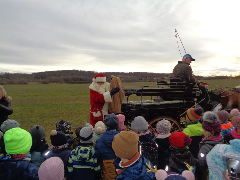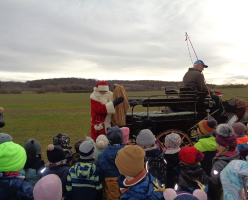 Dann war es endlich soweit und der Weihnachtsmann kam. Als die Kinder draußen die Glöckchen und das Hufgetrappel hörten, gab es kein Halten mehr. Sie rannten auf die Wiese hinter dem Kiga und empfingen den Weihnachtsmann, der sogar noch 2 Wichtel dabei hatte. Besonders wurden auch die Pferde in Augenschein genommen.
