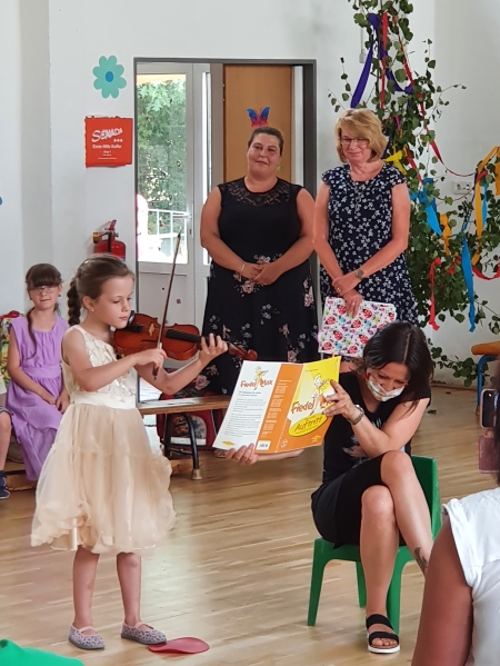 Dafür zeigten alle Mädchen und Jungen ihr Können. Lieder, Gedichte und ein Märchenspiel vom Rübchen gefiel allen Eltern und Großeltern. Auch eine kleine Geigenspielerin, unsere Maja, erfreute alle Leute mit einem schwierigen Musikstück.